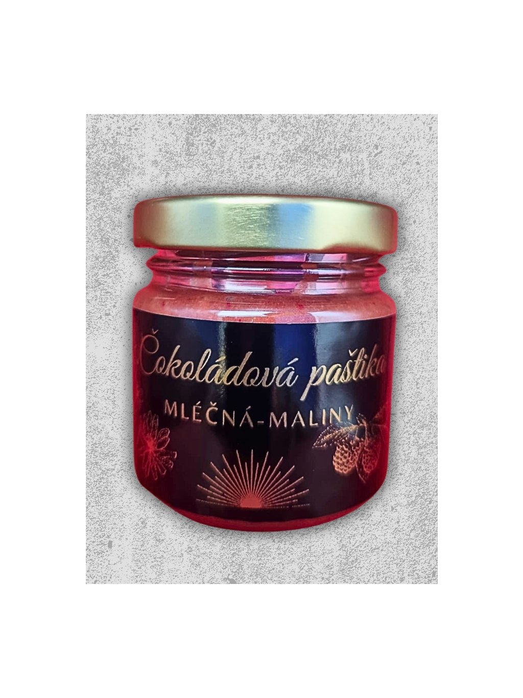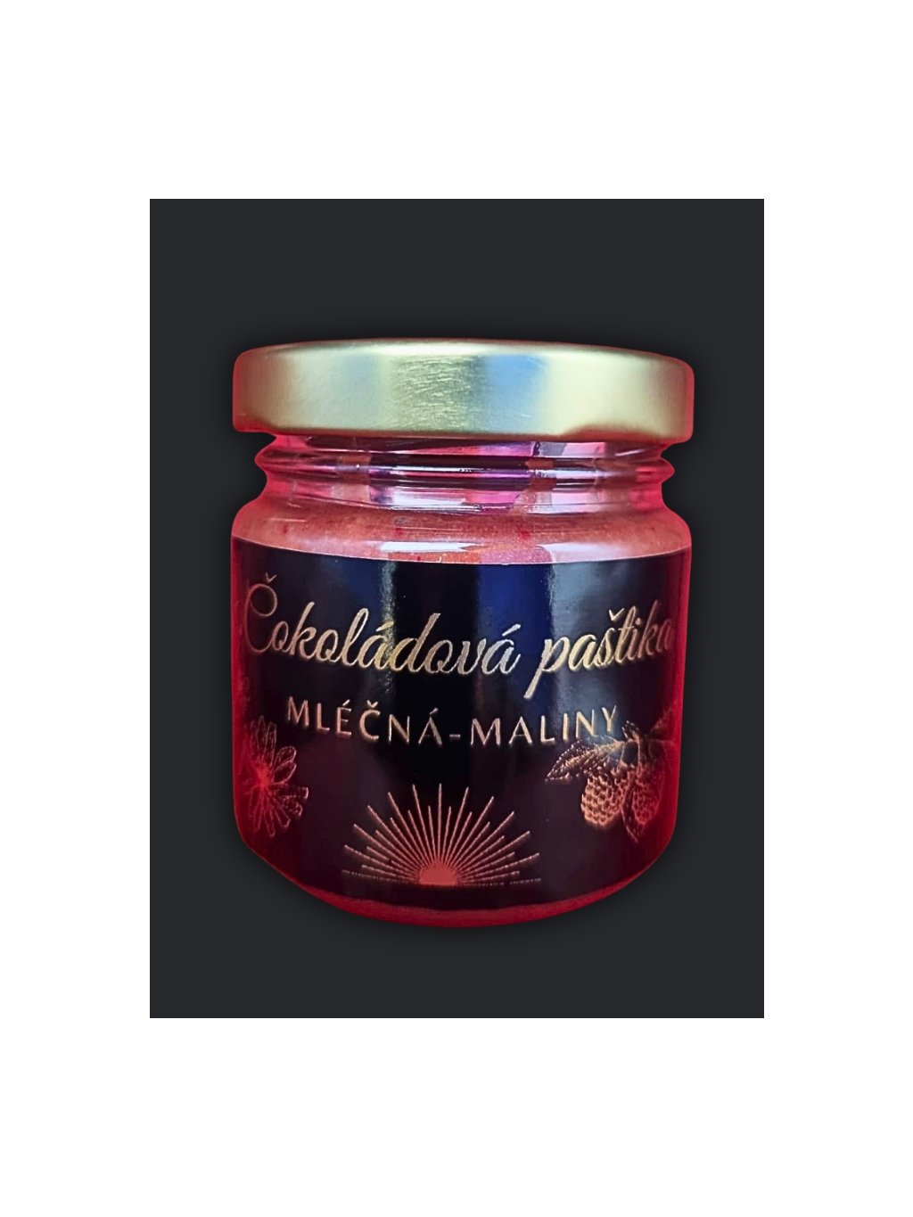 Čokoládová paštika z čekankového extraktu, mléčné čokolády s 33,6% kakaové sušiny a malin - mrazem sušených. Bez přidaného cukru.