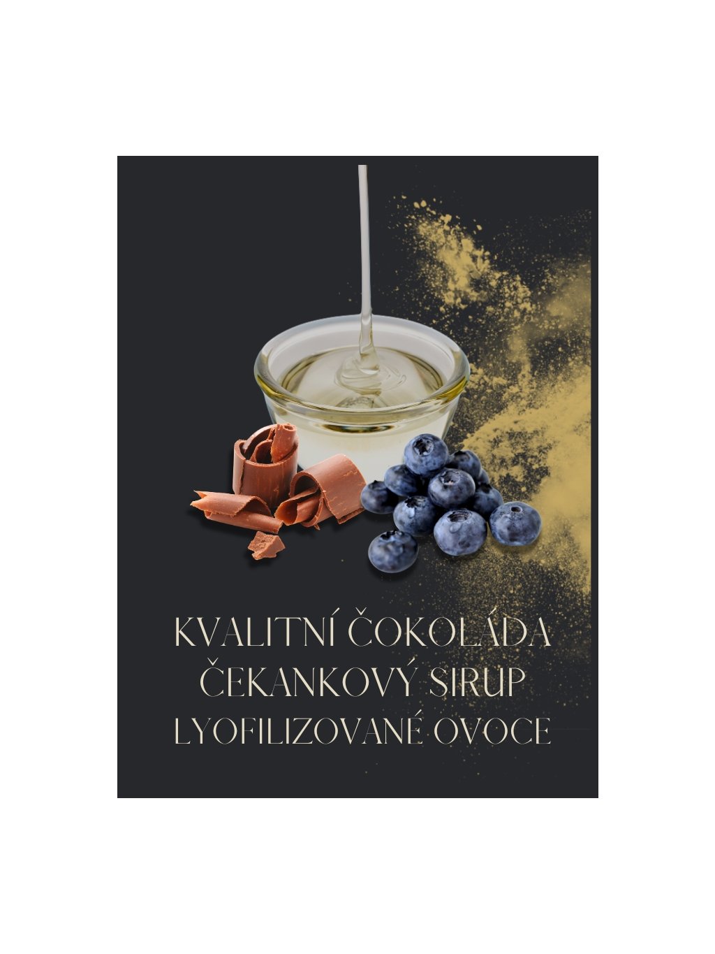 - 70% čekankový extrakt, 27% ruby čokoláda (47,3% kakaové sušiny), 3% mrazem sušený červený rybíz