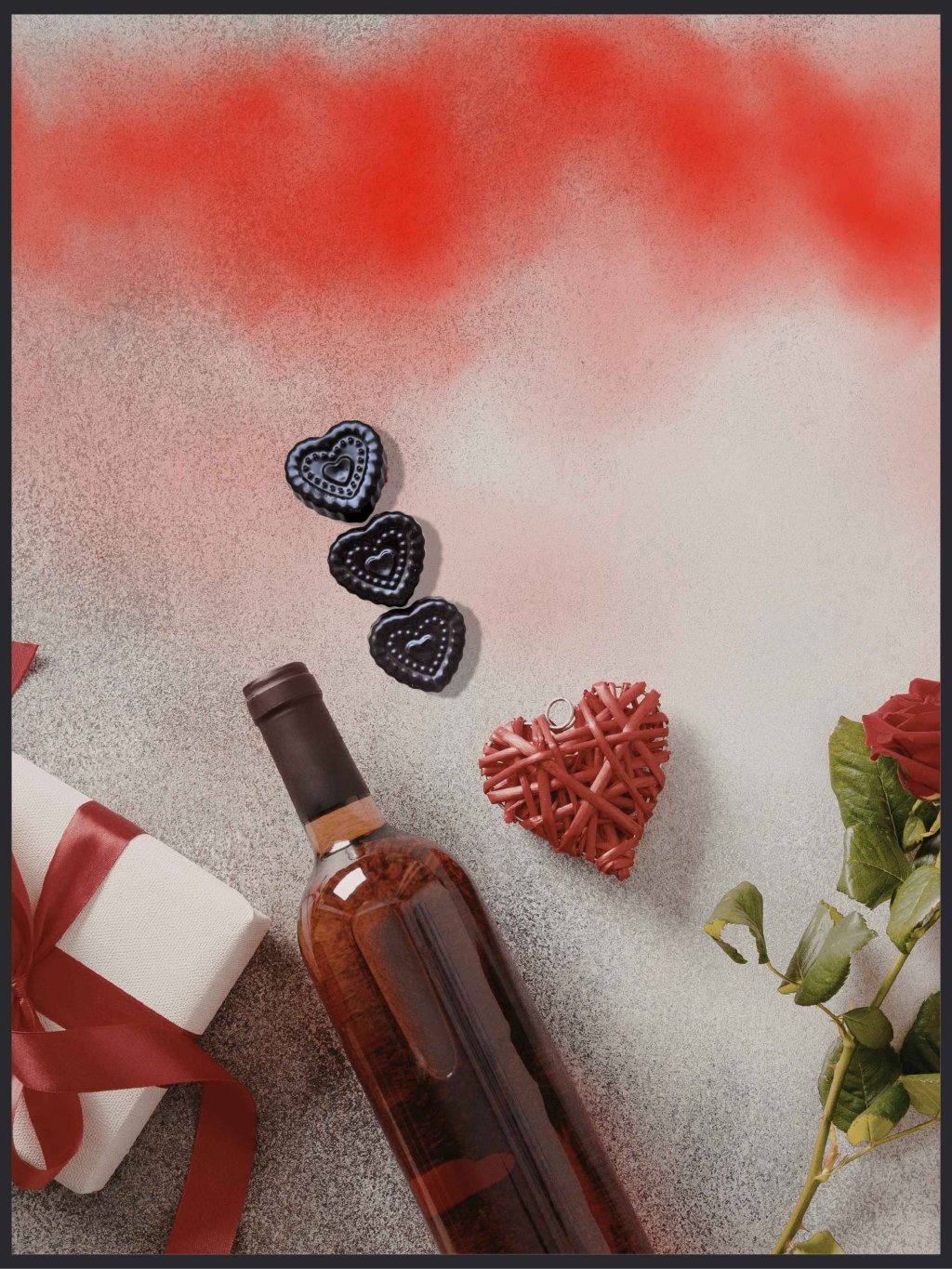 | Složení Čokoládové srdce Ruby čokoláda: | Ruby čokoláda 100% (Obsah kakaové sušiny min. 47, 3%, cukr, kakaové máslo, sušené odstředěné mléko, sušené plnotučné mléko, kakaová hmota, emulgátor sójový lecitin, regulátor kyselosti kyselina citronová, přírodní vanilkové aroma) |