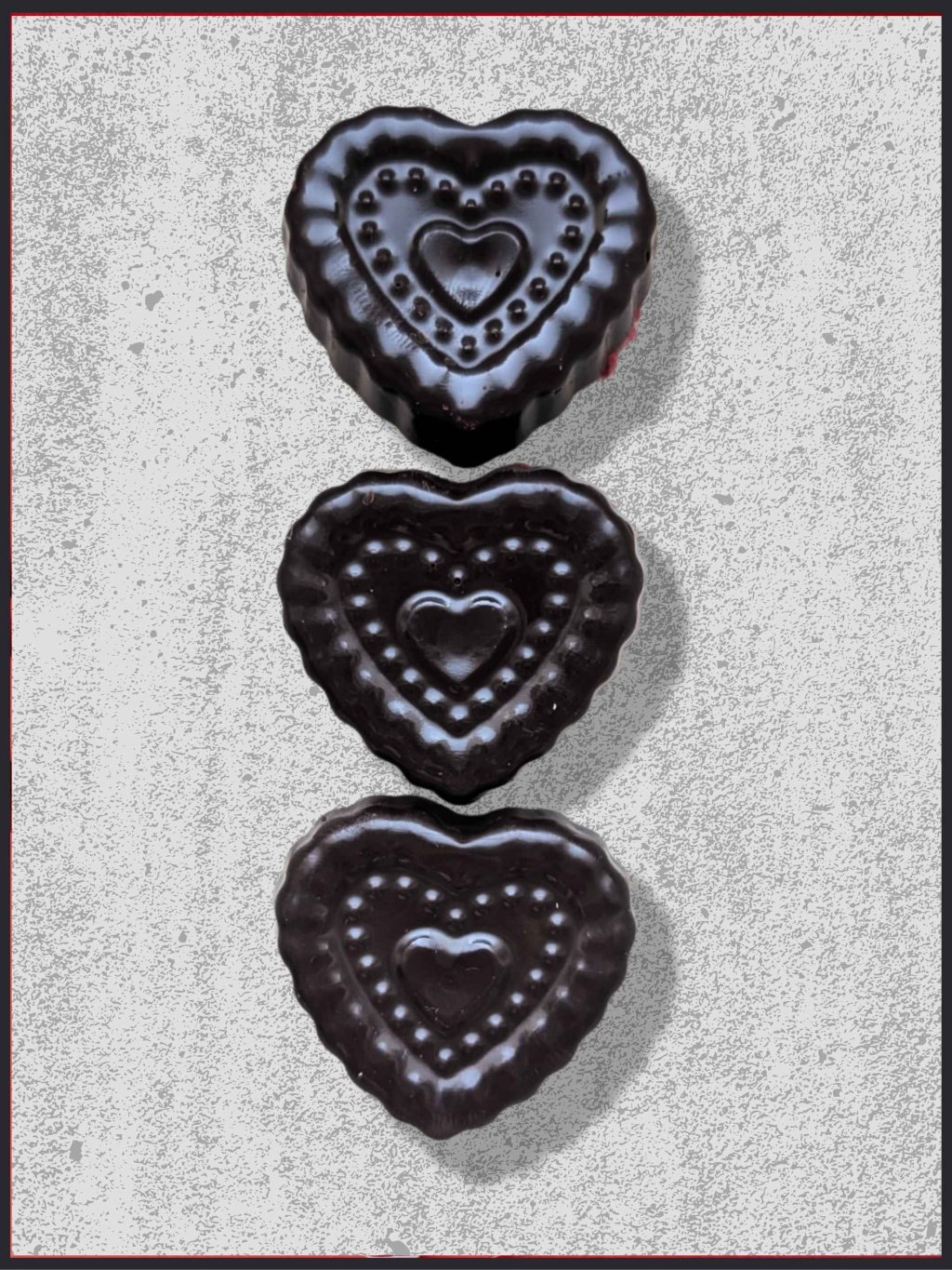 | Složení Čokoládové srdce Hořká čokoláda: | Hořká čokoláda 100% (Obsah kakaových součástí 70, 5%, kakaová hmota, cukr, kakao se sníženým obsahem tuku, emulgátor E322 sójový lecitin, přírodní vanilkové aroma) |