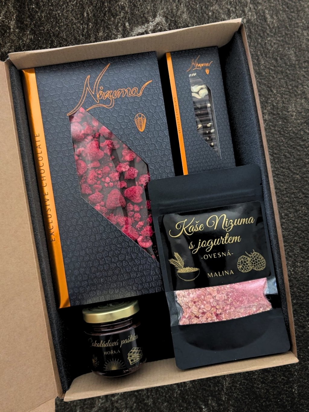 Dárkový box č.2 - 1x velká čokoláda, 1x čokoládová paštika, 1x mini čokoláda, 1x kaše s jogurtem