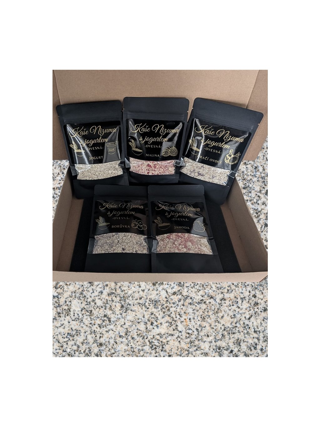 Vyzkoušejte náš degustační box! Obsahuje *5 kusů kaší* – najdete v něm všechny ovocné příchutě z naší nabídky a navíc i variantu s čistě jogurtovou chutí. Ideální volba, pokud si chcete dopřát ochutnávku všeho, co nabízíme. Unikátní spojení bílého jogurtu a ovesné kaše v jednom - krémová textura, jemná chuť, minimum cukru a 100% poctivé složení bez zbytečných přísad. Jen to nejlepší pro vás i vaše děti. Použitý jogurtový prášek odpovídá cca 80g čerstvého bílého jogurtu.