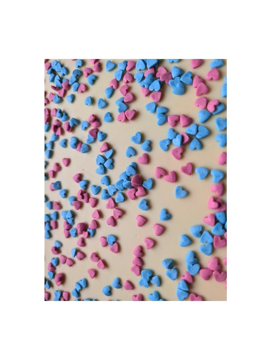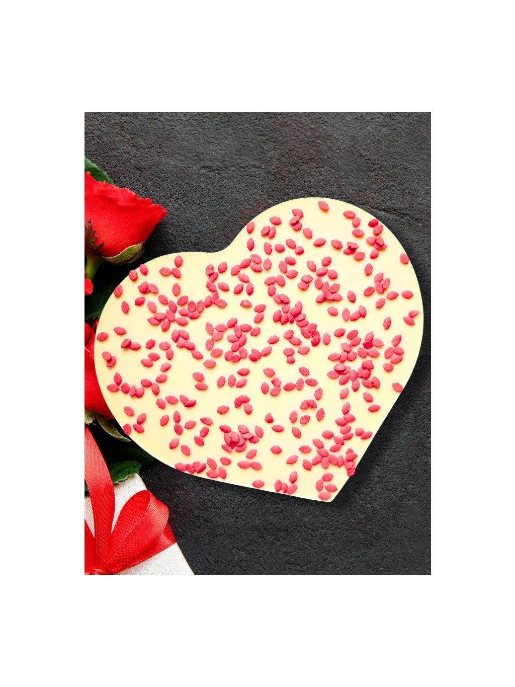 | Složení Velké čokoládové srdce Bílá čokoláda s posypkou: | Bílá čokoláda 92,9% (Obsah kakaové sušiny min. 28%, cukr, kakaové máslo, sušené plnotučné mléko, emulgátor E322 sójový lecitin, přírodní vanilkové aroma) posypka 7,1% (bílý cukr, pšeničná mouka, melasa, mastek, leštící látka Capol, rafinovaný palmový olej, modifikovaný škrob, zahušťovadla E415, E412, E466, stříbrný lesk, barviva E122, E132, E133) |