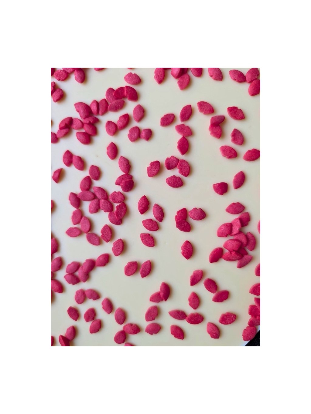 | Složení Velké čokoládové srdce Ruby čokoláda s posypkou: | Ruby čokoláda 92,9% (Obsah kakaové sušiny min. 47, 3%, cukr, kakaové máslo, sušené odstředěné mléko, sušené plnotučné mléko, kakaová hmota, emulgátor sójový lecitin, regulátor kyselosti kyselina citronová, přírodní vanilkové aroma) posypka 7,1% (bílý cukr, pšeničná mouka, melasa, mastek, leštící látka Capol, rafinovaný palmový olej, modifikovaný škrob, zahušťovadla E415, E412, E466, stříbrný lesk, barviva E122, E132, E133) |